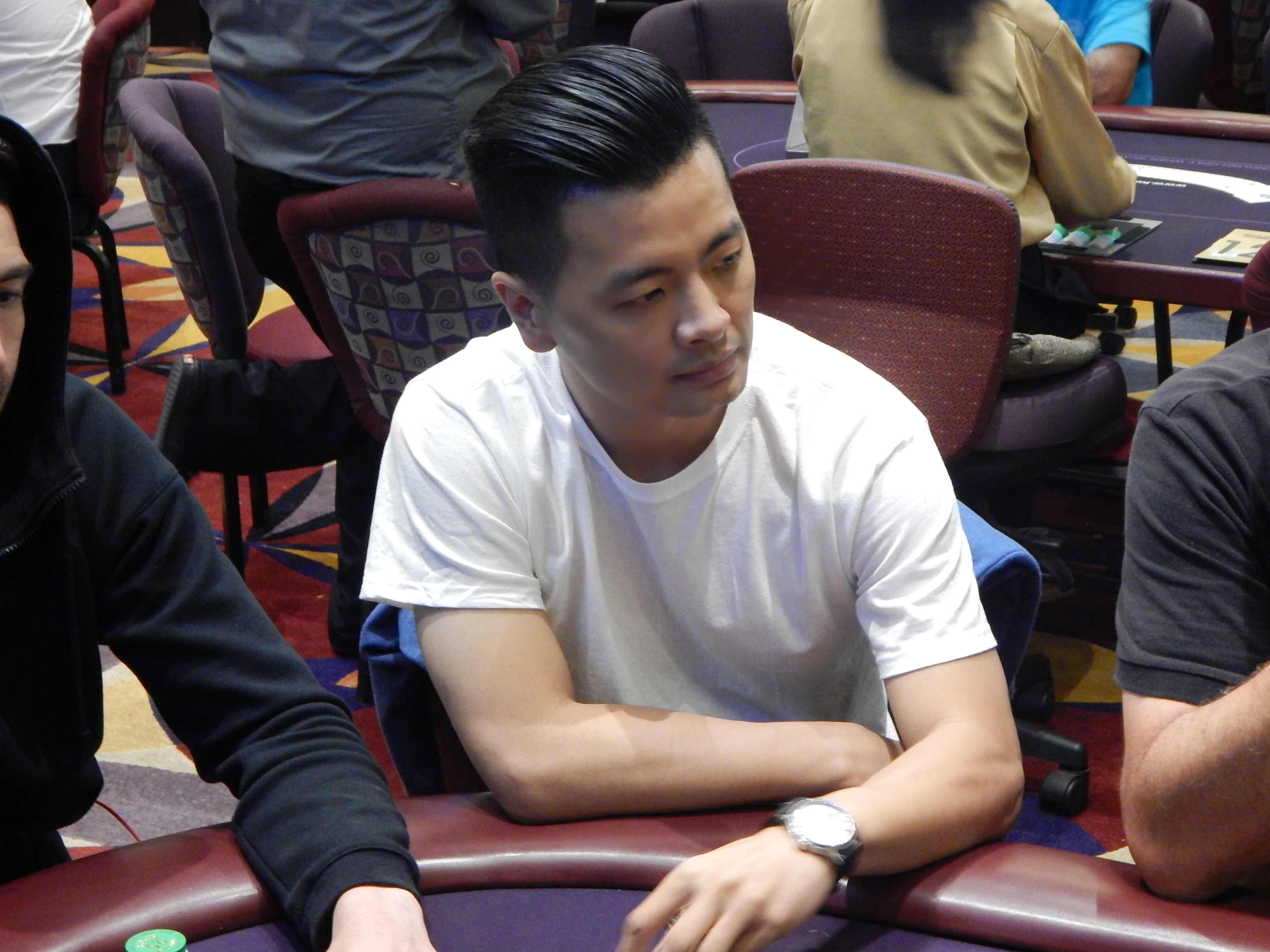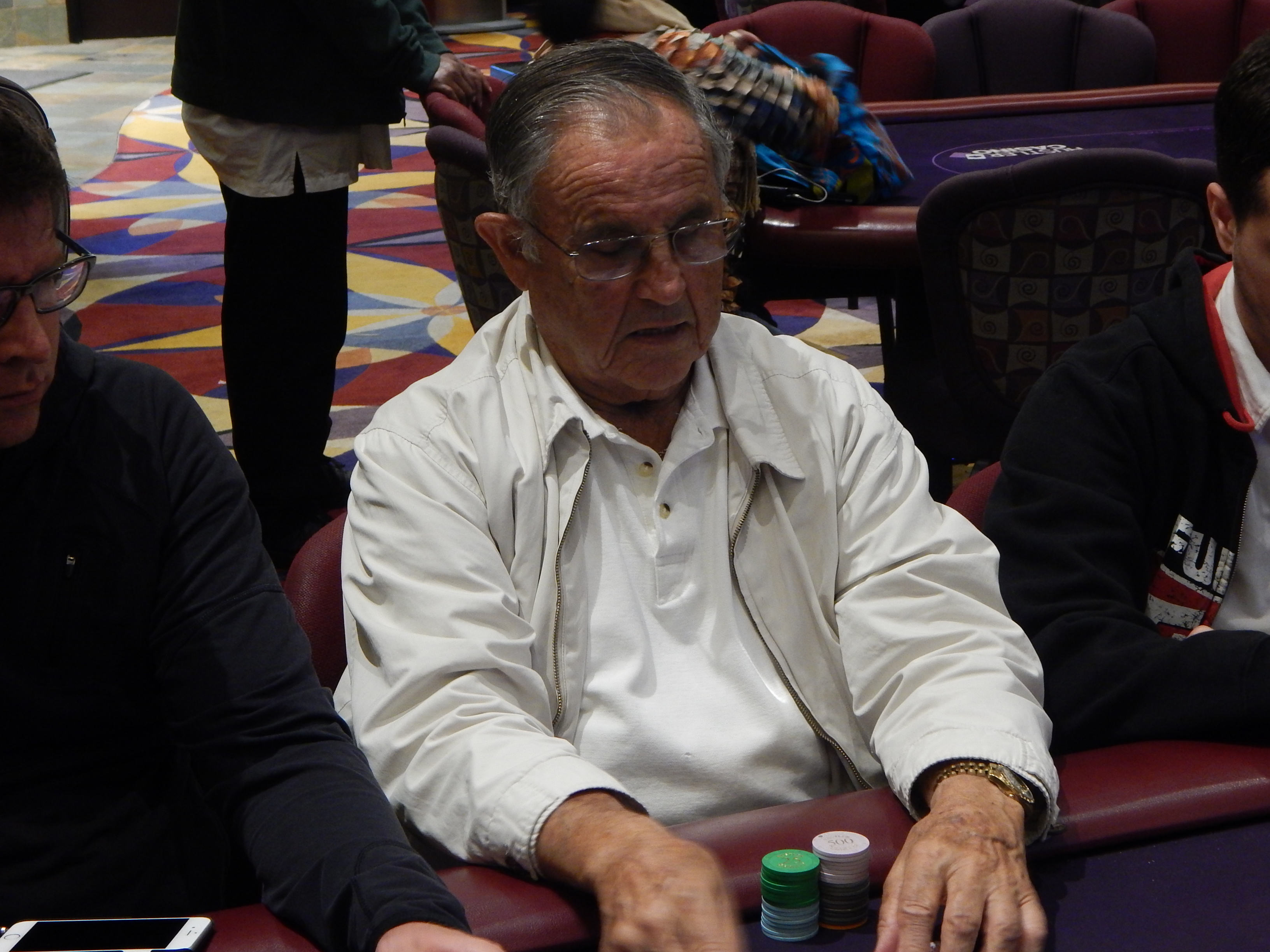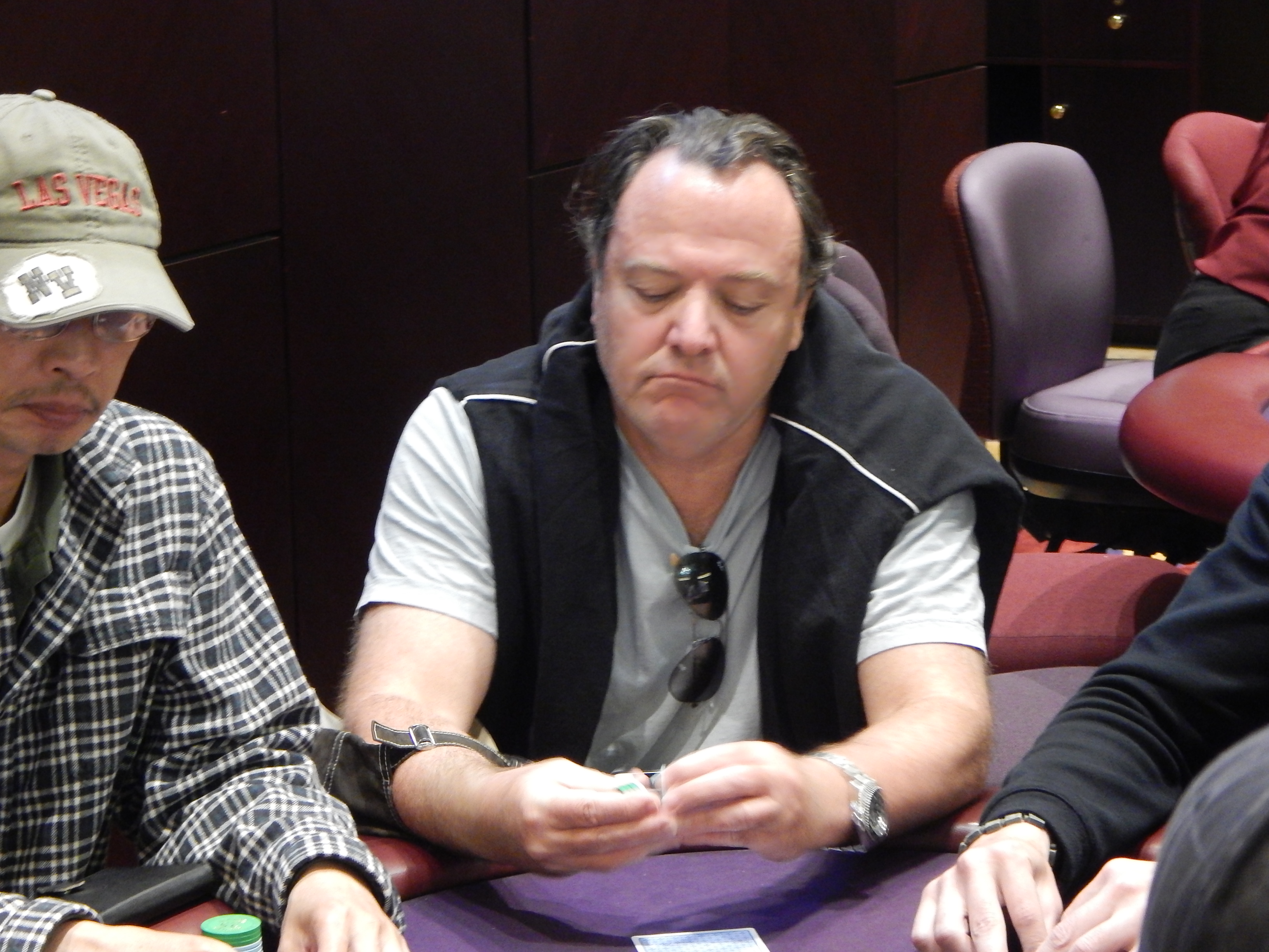 Flight H is in full swing here at the Hustler Casino, and we just took a walk over there to see who all was trying to get one of those coveted Day 2 tickets. We saw quite a tough table, with John Hulett, Ron West, and Erich Karle all rubbing elbows next to each other. We also spotted former WPT winner Eric Hershler in the field, as well as LA based poker legend Tony Ma.