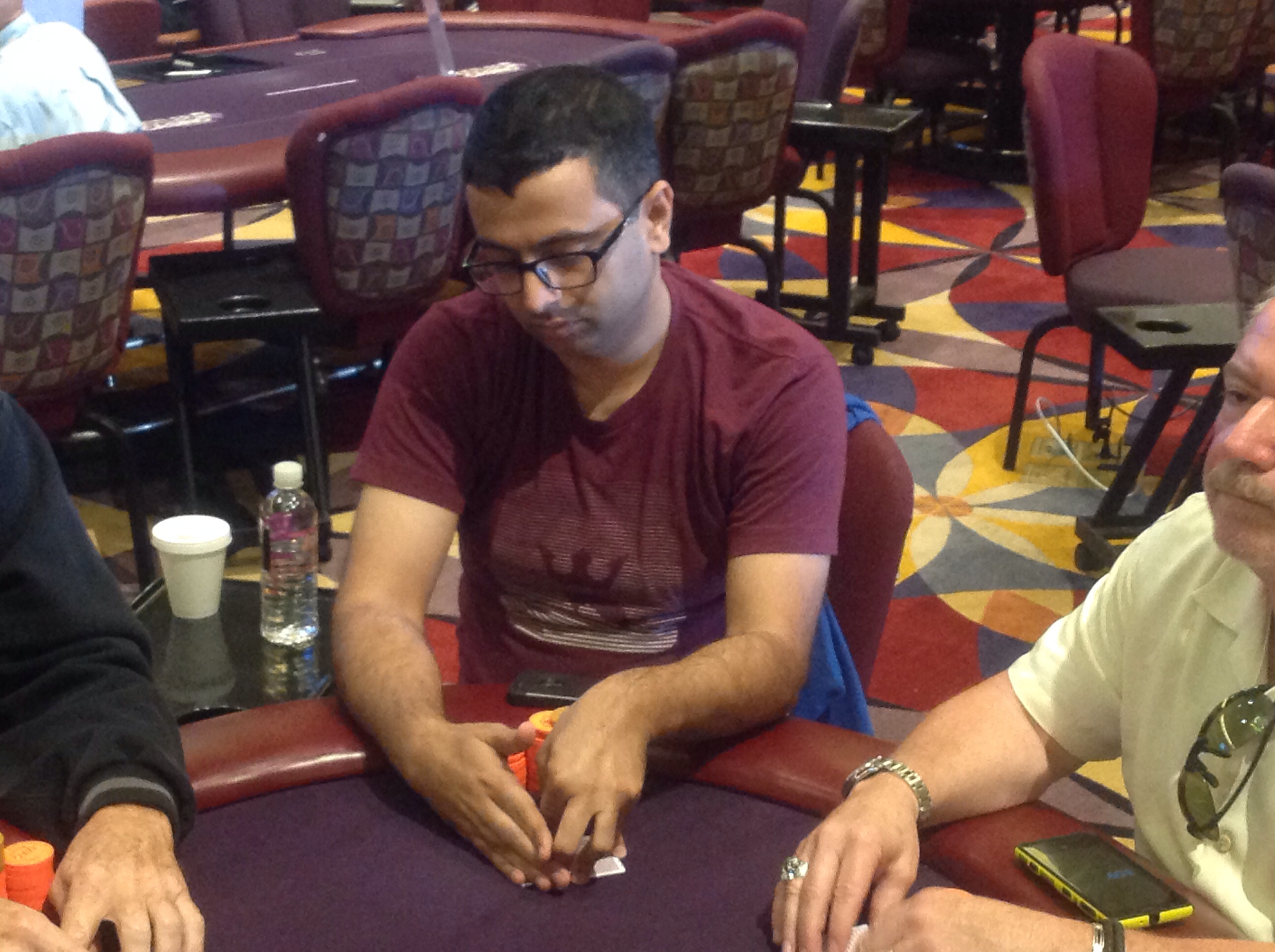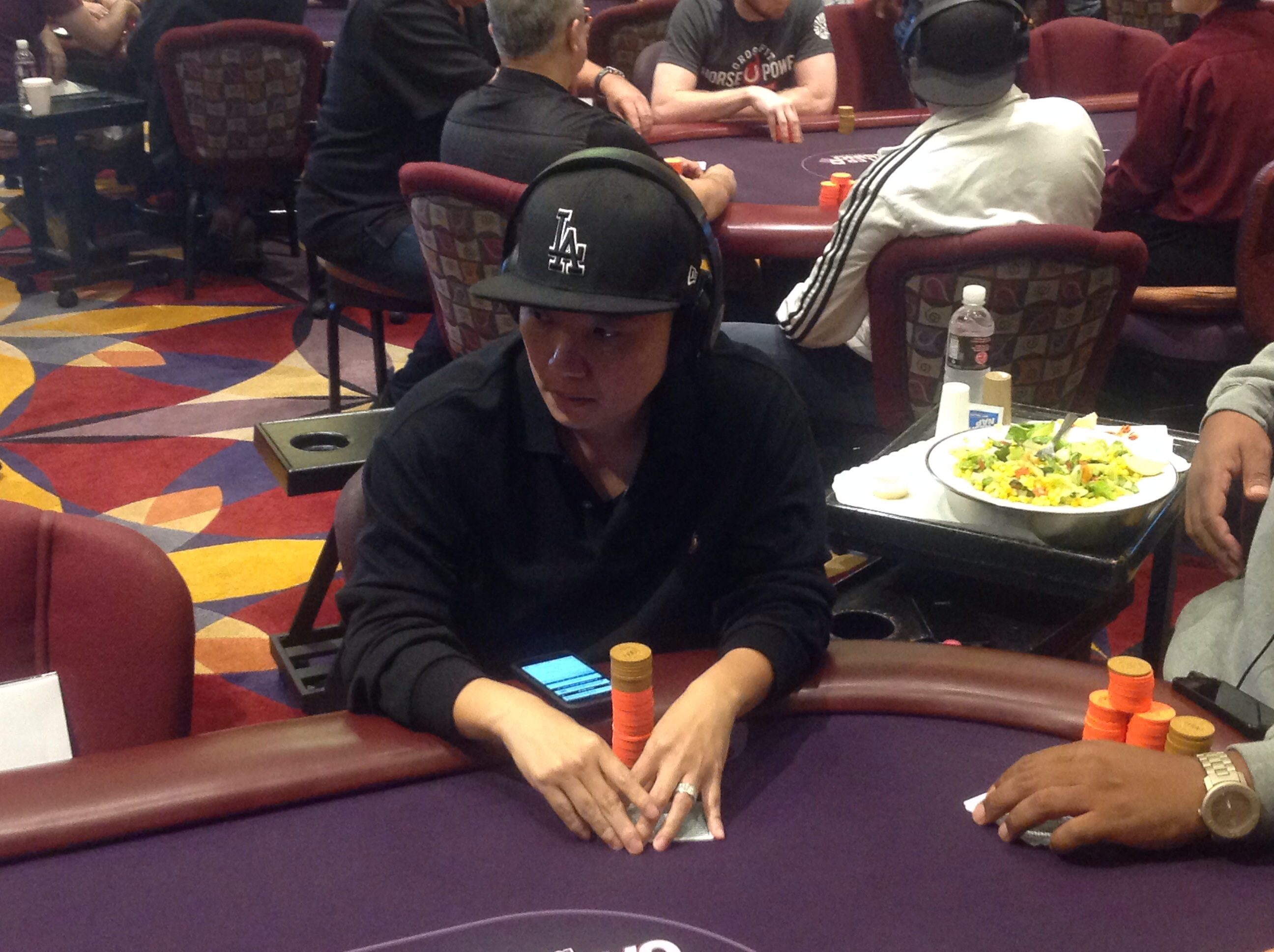 As promised, here is the next group of player photos from today’s restart. Amongst this crowd is Peter Hengsakul, who is one of the big stacks coming into the day. Also here are LA regulars Nipun Java and Phong “Turbo” Nguyen, along with Ron West, who had quite a successful Grand Slam of Poker a few months ago. West secured his biggest career cash early in the series with a 5th place finish in Event #2 for $25,755. Just two weeks later, he nearly topped that when he placed in 6th for $21,100. He will be looking to top those today, and will do so if he finishes in the top two.