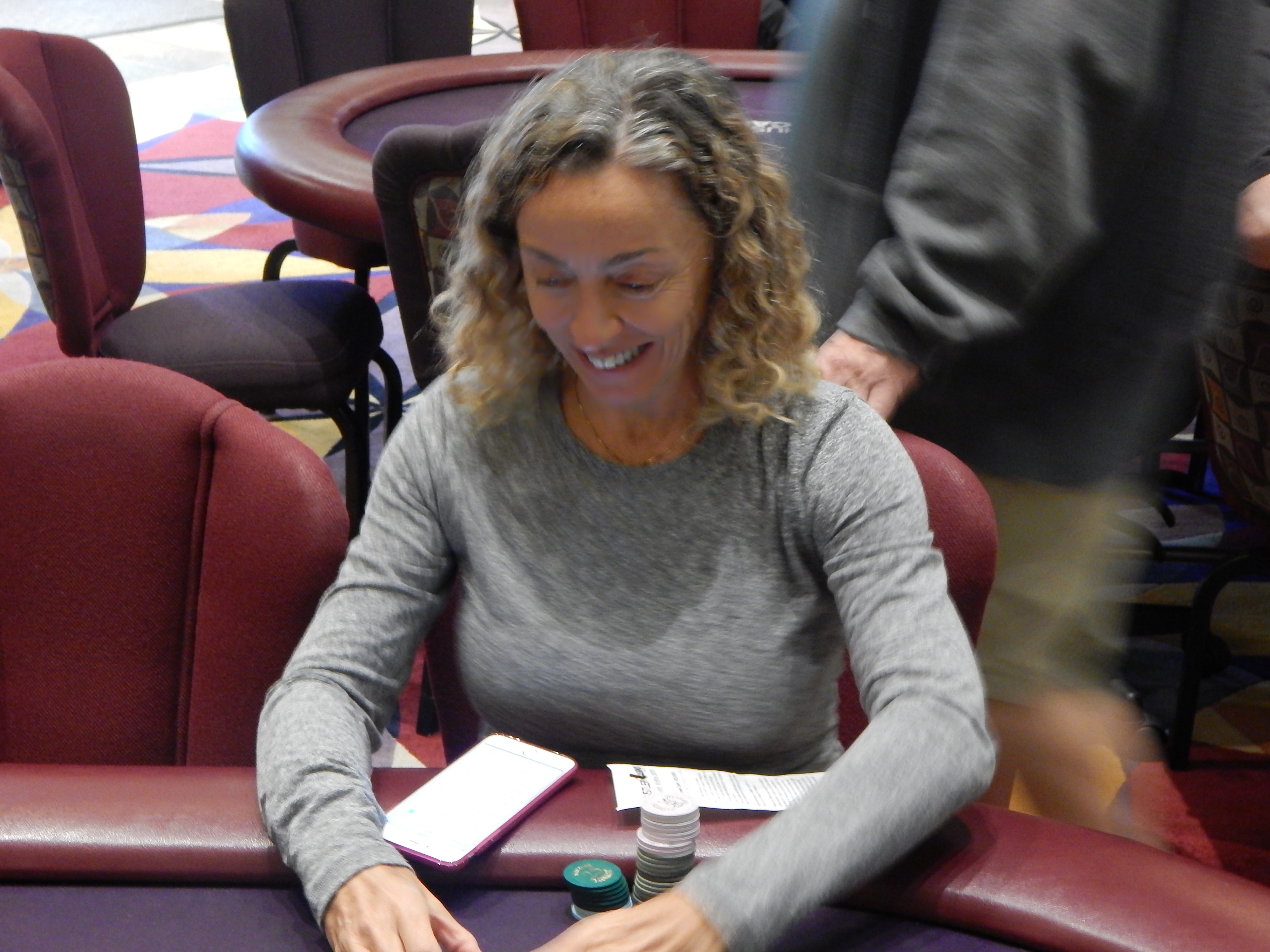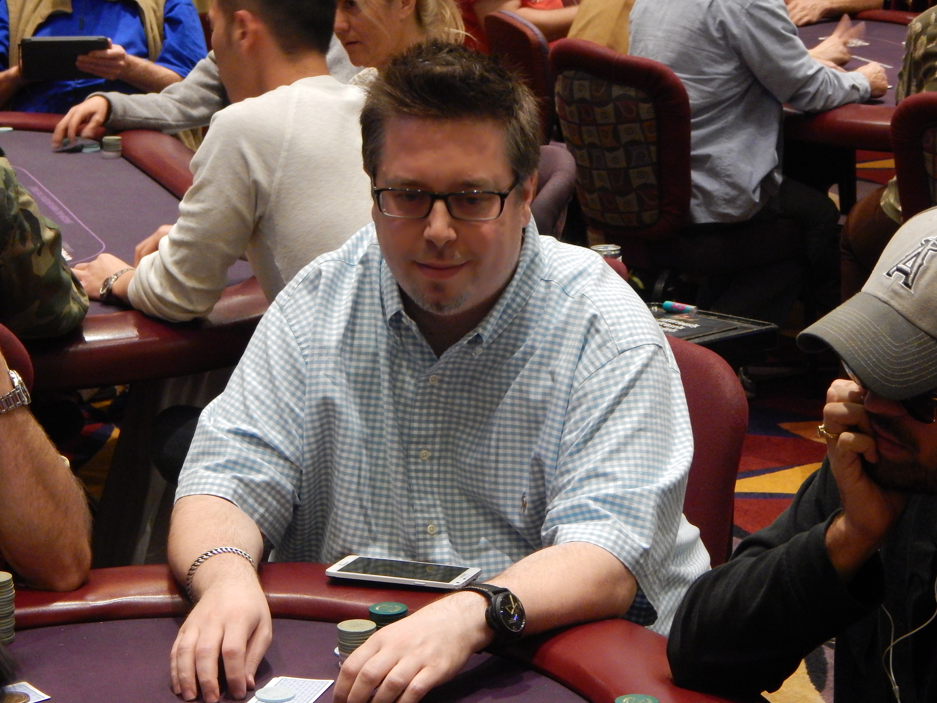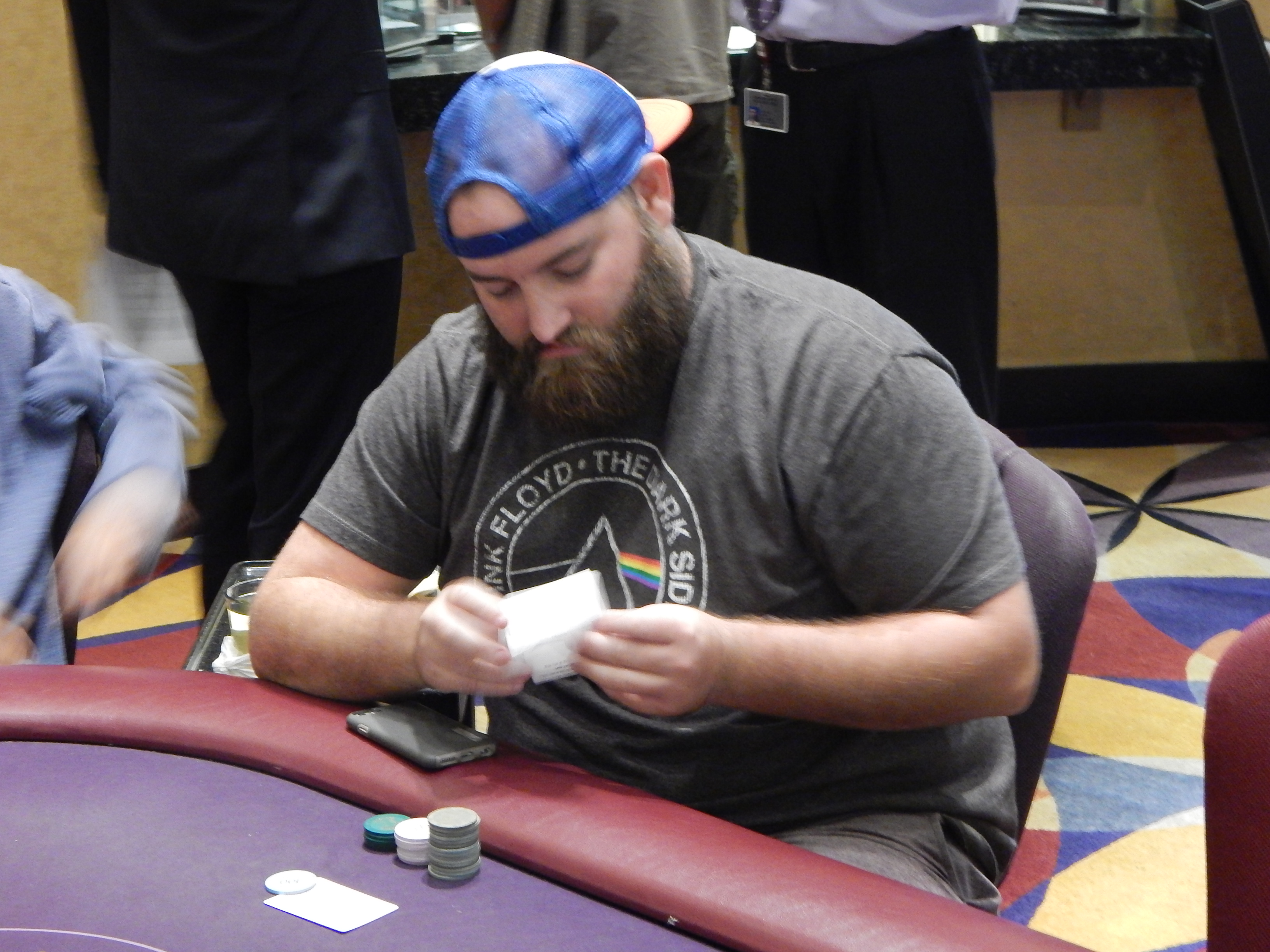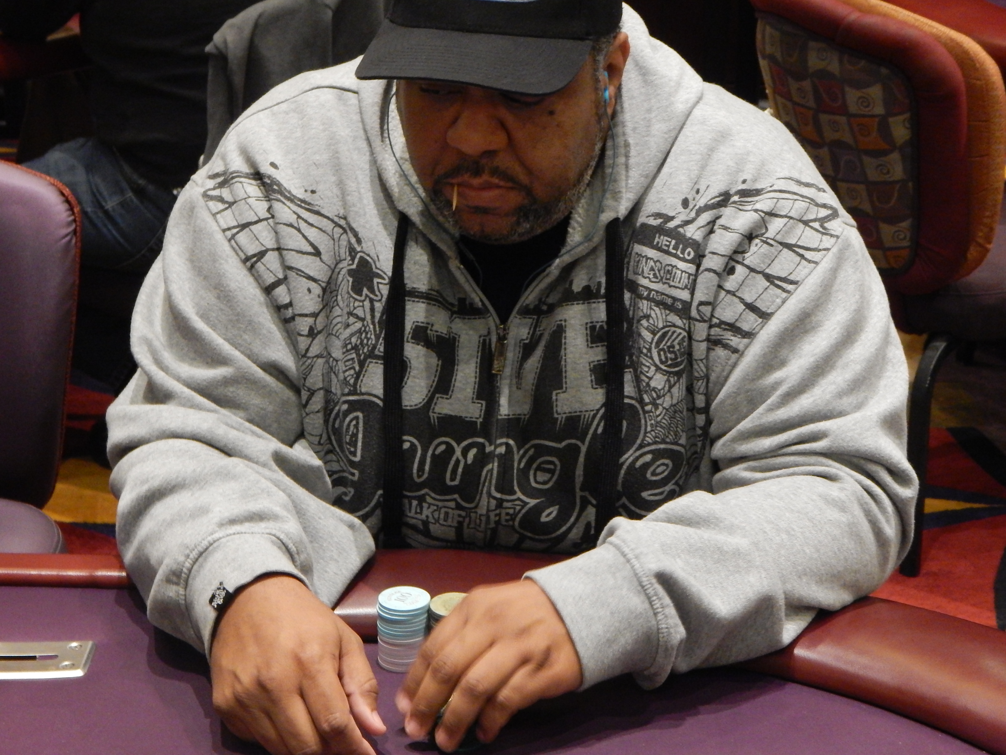 The $250,000 Guaranteed Day 2 restart isn’t the only poker being played today, as the $20,000 Guaranteed event is in full swing here at the Hustler Casino. We took a walk over to see who we could spot playing over there. We notice Kevin Gimble, who made Day 2 of Event #5, had hopped into this event after being eliminated from the restart. We also saw Gene O’Leary, who finished runner-up in the first major event at the Spring Poker Classic this year.